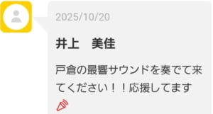 →応援ありがとうございます☺️またもや、先輩からのメッセージ😢その応援に全力で応えるこが出来るよう精一杯響かせます🎵