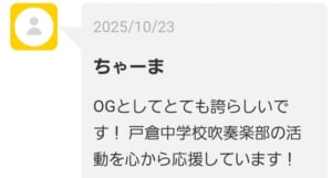 →応援ありがとうございます☺️戸倉のレジェンドからのメッセージに感動しております😢❤️私たち保護者会メンバーも、子供たちが卒部してからも戸倉のサウンドをずっと応援していきたいです✨