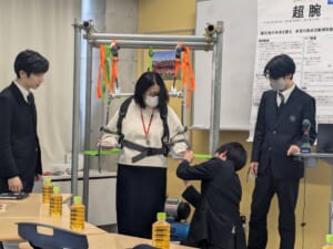 初めての体験会で、初めての対面で緊張してしまい、聞いている人を巻き込んで発表するという事前に決めた目標を達成することができなかった。これまで高校生の体の大きさで設計や性能など技術面に意識が向きがちだったが、実際に体験してもらうことで装着のしやすさや操作のわかりやすさなど使う人の視点で考えることで新たに気づくことができた。最初は学校の授業内の取り組みとして始まったが、新たなアドバイスやクラウドファンディングへの挑戦を通して、より良いものへと発展してきたと感じている。今回の体験会を通して得た学びを今後の改良や開発に生かしていきたい。(渡部)