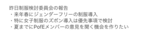 制服検討委員会にて来年度からの女性用スラックスの導入が決まりました。今までの活動が結果になってとても嬉しかったです。