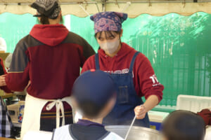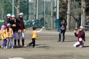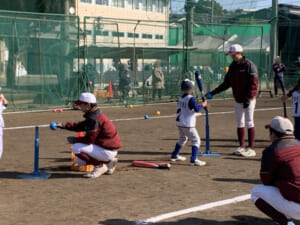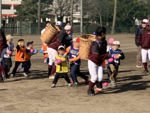 当日は、まず鬼ごっこで体を温めた後、バッティング・スローイング・ボールキャッチのローテーション形式による練習を行いました。最後には学年ごとにゲームを実施し、野球部員も園児・児童の皆さんとともに、笑顔あふれる楽しい時間を過ごすことができました。また、練習後には女子マネージャーが心を込めて作った豚汁が振る舞われ、参加者一同、心も体も温まるひとときとなりました。