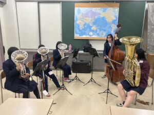 私たちはユーフォニアム3人、チューバ1人、コントラバス1人の五重奏をします。私たちは縦を揃え、楽器の音量を活かして迫力ある演奏を目指し日々練習しており、より良く聴こえるような音量バランスにこだわっています。そして曲調をもっと表現することが、今の課題です。