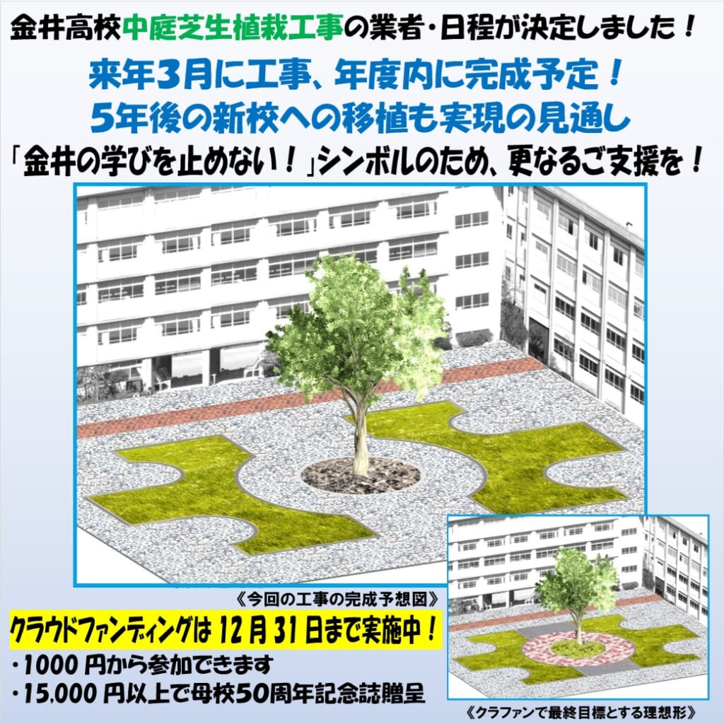 同窓会がクラウドファンディングを実施している中庭再生計画の第一段階である、中庭・旧ツツジ植栽部分の芝生化工事ですが、このほど業者選定が完了し、これに伴って来年3月の第2週から月末にかけて工事が行われることになりました。春になって気候が温かくなってからでないと植栽後の芝生の定着が難しいため年度末に日程を設定したとのこと。これにより、クラウドファンディングでの目標としていた第一段階で、今年度分の工事となる芝生化が年度内に完了する見込みとなりました。また、5年後の舞岡高校との統合に関連して、今回の芝生を新校に移植(夜間照明の移設も)できる見込みとなったことも判明、これでクラウドファンディングの新たな目標である「金井高校の証を新校に繋ぐ」ことにも見通しが立ちました。