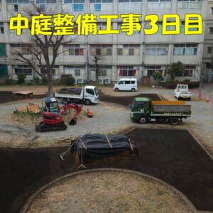 3月11日(水)、中庭整備工事3日目です。芝生植栽部分の形がはっきりしてきました。中央に積まれているのは、植え付け用の芝生です。