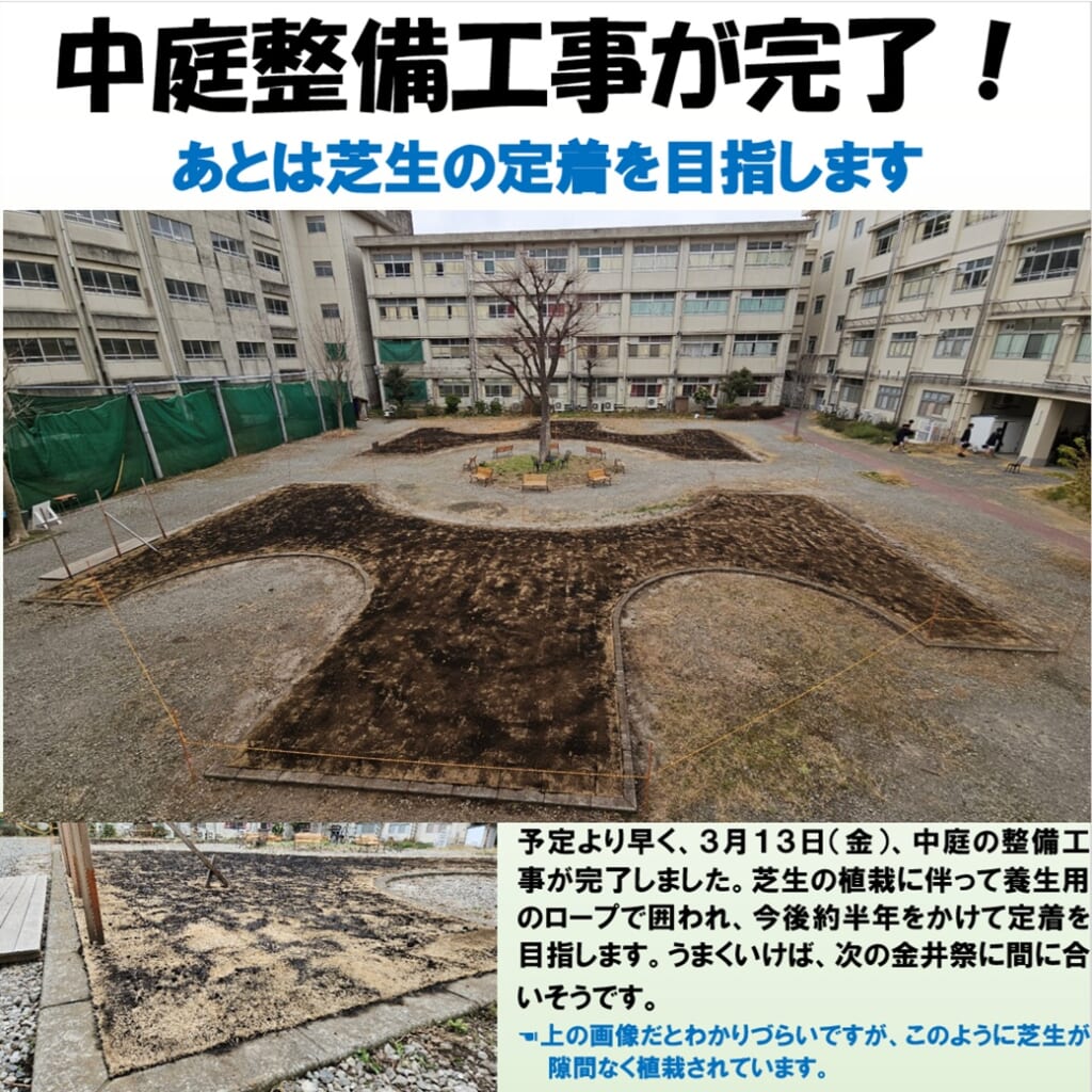 おかげさまで天候に恵まれたこともあり、予定よりも早く5日間で中庭の整備工事が完了しました。ツツジの花壇だったエリア全体に芝生が敷き詰められ、ロープで仮の囲いがされました。このエリアが生徒の憩いの場になるためには、これからしばらくはしっかり養生をして、芝生の定着を目指します。芝生がしっかり定着し、手入れもきちんと行えば、雑草の生えることの無い、きれいなグリーンのエリアになるとのこと。うまくいけば、9月の金井祭では、皆がくつろげるような空間になるでしょう。
