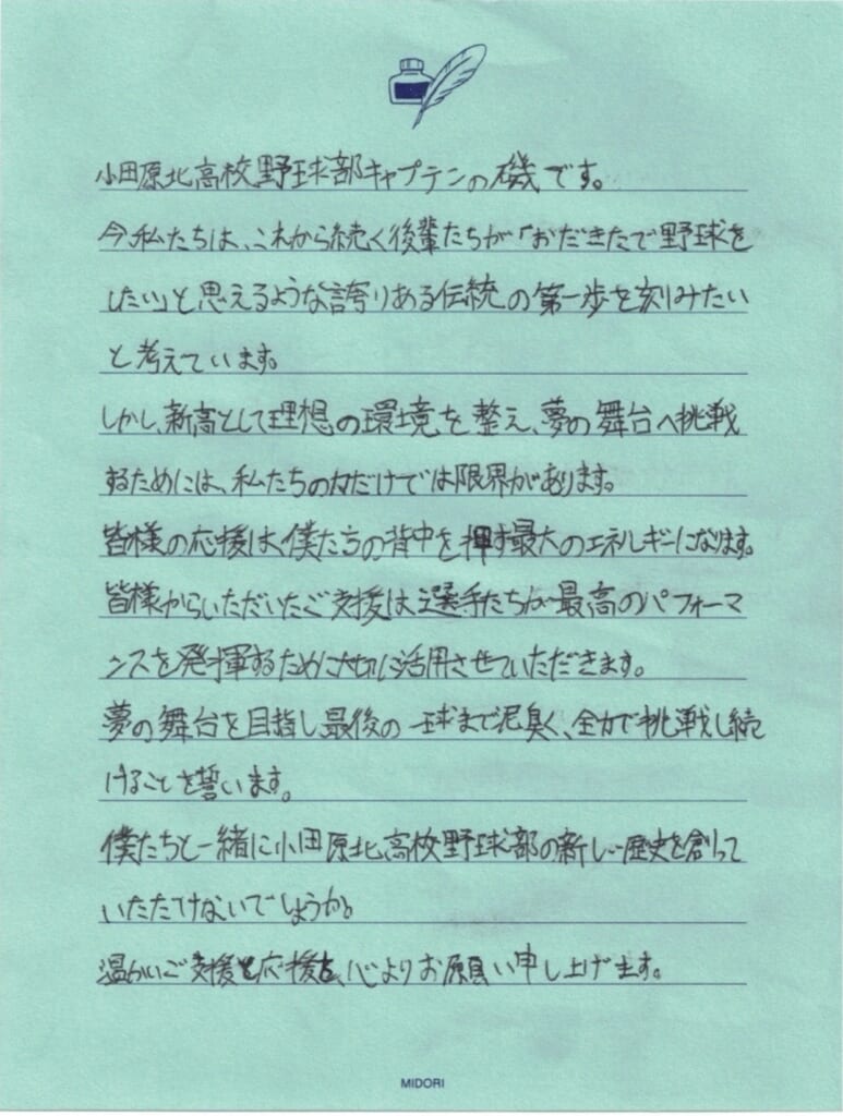 これから入学してくる未来の野球部員たちを支える小田原北高校野球部の基盤になります。