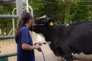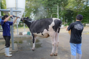 共進会に向けて、より牛を美しく見せるために高圧洗浄機を用いてのマッサージを行っています。牛は皮膚が硬いため人力でのマッサージは難しく、高圧洗浄機を使用します。特に肉のつきやすい部位に決まった時間当てることでその部位をシェイプアップすることができます。夏には、暑さ対策にもなりますね☀️