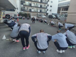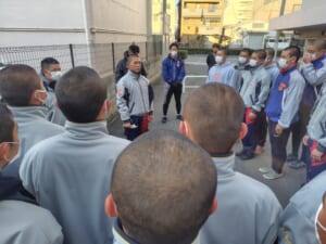 朝の行動は大体決まって、「起床、散歩(ゴミ拾い)、体操、ミーティング、1分間スピーチ、朝食、出発」とルーティン化しており、この規則正しい生活が、リズムを生んで集団生活の当たり前が良いチームワークとなります。