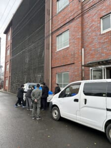 吹奏楽部は楽器や機材をトラックに積み、雨に濡れないようしっかりとシートで覆い、乗車するバスまで運ぶお手伝いをしています。