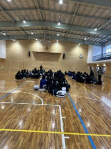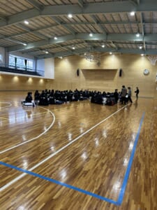 体育館では、吹奏楽部、チアダンス部、マルチメディア部、応援指導部、そして生徒会生徒たちが、今回応援団として派遣されるにあたり、先生方から諸注意などをしっかりと聞いています。