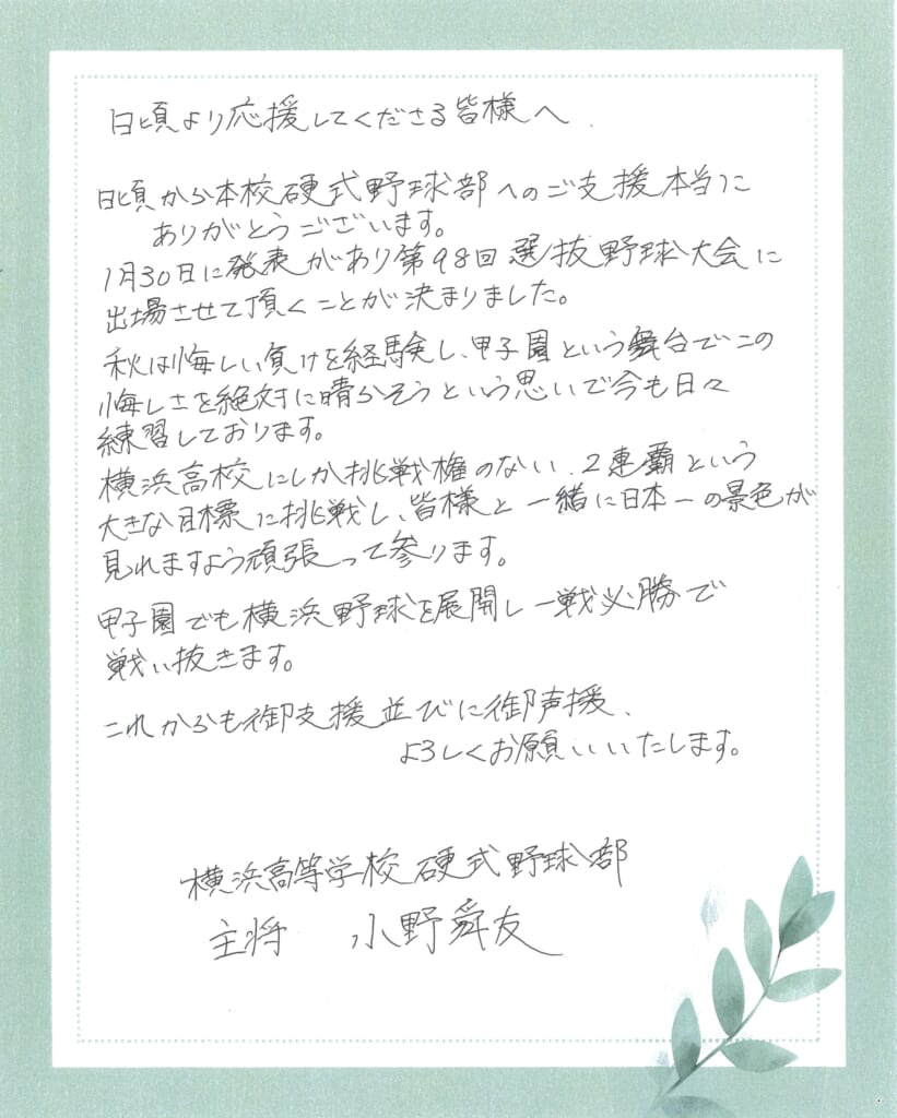 来たる3月19日の開幕に向けまして、変わらず練習に励み、甲子園で持ち合わせた力を遺憾無く発揮出来るよう精進して参ります。秋の敗戦を春の甲子園で悔しさを晴らす。この気持ちが横浜を強くすると確信します。どこのチームよりも「思い」を確かに持ち、大事にして、一戦必勝で頑張ります。