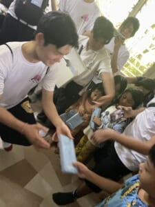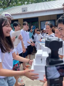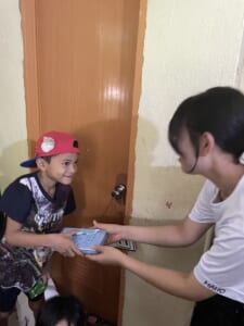 パンダノン島の小学校・山のスラムエリアに住む子供たちに、皆様からご寄付頂きました寄付金で購入致しました「おやさいクレヨン」「ボールペン(オーシャンプラスティック製)」を、昨年度の先輩からバントを受け取り、後輩たちが届けて参りました!生徒たちは