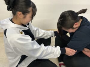 ペアーで念入りに柔軟体操 先輩から後輩へのアドバイス