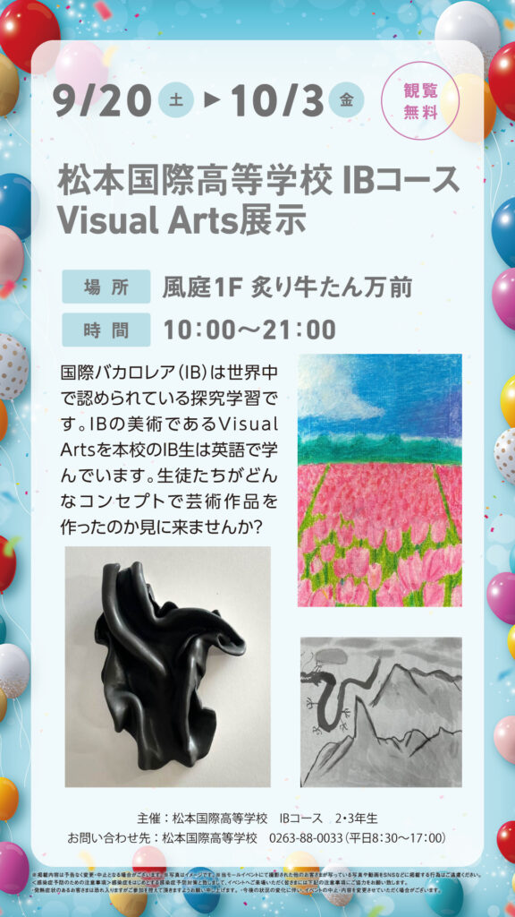 本校IBコースの2・3年生による「Visual Arts展示」が、松本イオンモール1階風庭エスカレータ脇にて、9/20(土)~10/3(金)に開催されます。IBの美術であるVisual Artsで、生徒が創り出した作品の数々が展示されています。各生徒がそれらの作品に、どのような概念や考えを込めたのかを見に来ませんか?