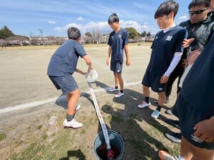 先日サッカー部では、グラウンドにある散水ポンプでグラウンドに水を撒きました!!