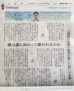 明日からの定期テストに向けて、テスト期間中のため今週も部活動はお休みでした。そんな中、先日11/14(金)付の朝日新聞の中で、作曲家の信長貴富先生の連載コラム「くちびるに歌を」の中で、なんと!滝ノ水中の名前を出してお話しをしてくださっています。全日本、富山大会の振り返りの中で取り上げてくださっていますので、こちらでもご紹介させてください。