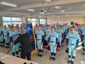 毎日新聞大津支局長・藤田様より鮮やかな青の選抜旗が授与され、近江ブルーのユニフォーム姿の選手たちは