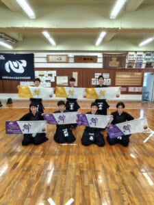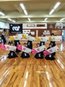 このたび、試合に向けてオリジナルの面手ぬぐいを作成しました。ピンク・オレンジ・パープルの3色で、右下には学校公式キャラクターの「いーとん」も佇んでいます。