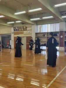 稽古では一本勝負を行います。審判を立てて魂の真剣勝負です。