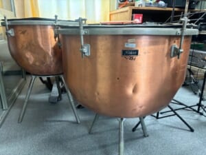 手回しでチューニングをするNikkanのティンパ二(1970年以前に製造)です。かなりぼこぼこです。