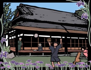 地域を代表する企業家の元邸宅である安川邸が過去に持っていた、人々のいこいの場としての側面を描きました。周囲には戸畑のシンボルの一つである菖蒲をあしらいました。