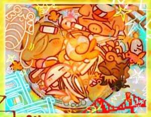 皆で仲良く「ちゃんぽん」の湯に入ってる楽しげな様子を表現しました。お風呂のような大きな器の中にちゃんぽんの具材が楽しそうに入っています。そこに戸畑区の「牧山の馬」「まごじ凧」「大山笠」「若戸大橋」もちゃんぽんしました。色合いのこだわりは、食べ物をテーマにしているので全体的に暖色に統一しました。この絵が地域の方々に愛され、皆がしあわせになって欲しいという願いを込めました。