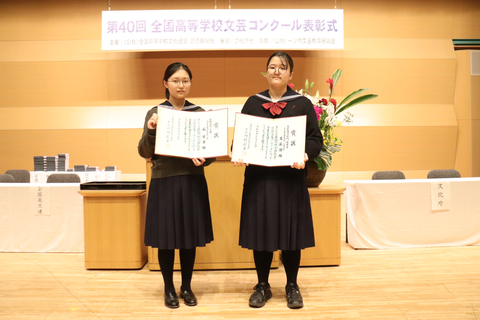 12月13日(土)に東京代々木にある国立オリンピック記念青少年総合センターで行われた第40回全国高等学校文芸コンクール(全国高文連・読売新聞社主催)表彰式に出席してきました。今回、本校の文芸部誌「いさらゐ67号」は優秀賞を受賞することができました。昨年の66号は最優秀賞をいただくことができただけに少し悔しい思いもありますが、少ない人数で力を合わせ、全力で作り上げた今年の「いさらゐ67号」も素晴らしい評価をしていただき、とてもうれしく思っています。表彰式では今年本屋大賞を受賞された阿部暁子さんの講演会も行われました。今回の受賞を励みに、1・2年生は、来年の68号に向けて新たな気持ちで頑張っていきます。その他、今回の結果は以下の通りです。
