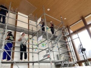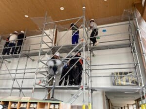 初めて身に付ける命綱とヘルメットに戸惑いながら、足場の4段目まで登ると想像以上の高さに足が震える中、小城高校2年1組42名の生徒たちによって作業がスタートしました。