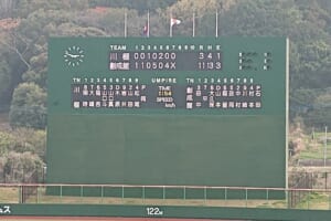 初回と2回裏の攻撃ではテンポ良く犠飛で得点すると、4回裏にはクリーンナップの三者連続長打などで5点を挙げました。一方、3回と5回表の守備では失策が失点に結びつく場面もありましたが、6回裏には中軸と代打にも適時打が飛び出し、さらに4点を追加し8点差コールドとなりました。